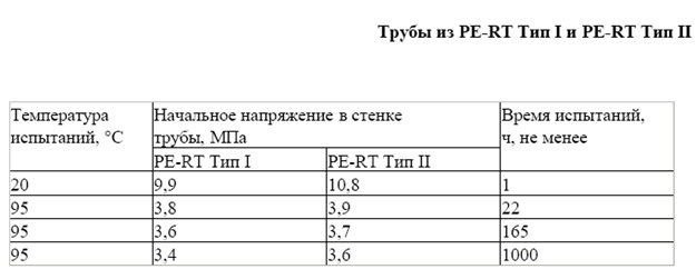 Исходя из данных, приведенных в таблице, при температуре 200С напряжение в стенке PE-X - 12 МПа, PE-RT - 10,8 МПа. Т.е. PЕ-Х обладает большей прочностью, чем PE-RT. То же можно видеть и при 950С.