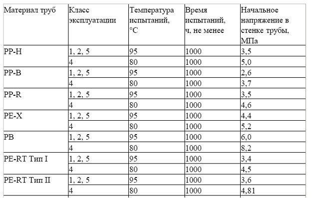 ГОСТ Р 52134-2003 указывает классы эксплуатации, что особенно интересно в плане применения пластиковых трубопроводов. Требования к прочности труб приведены в таблице 26 ГОСТ, в нашей статье она обозначена как Таблица 2: